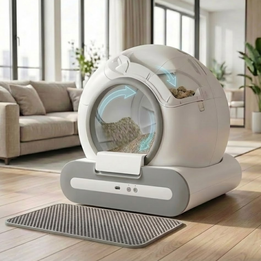 Une fois votre chat sorti, la litière s’auto-nettoie automatiquement.
